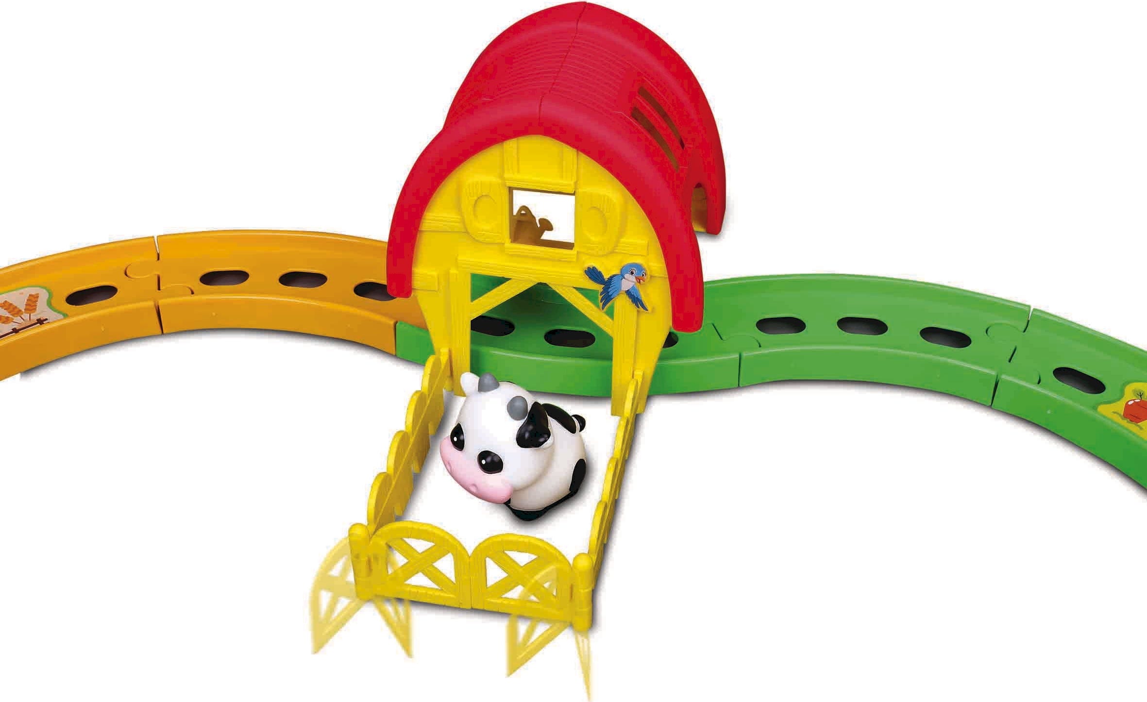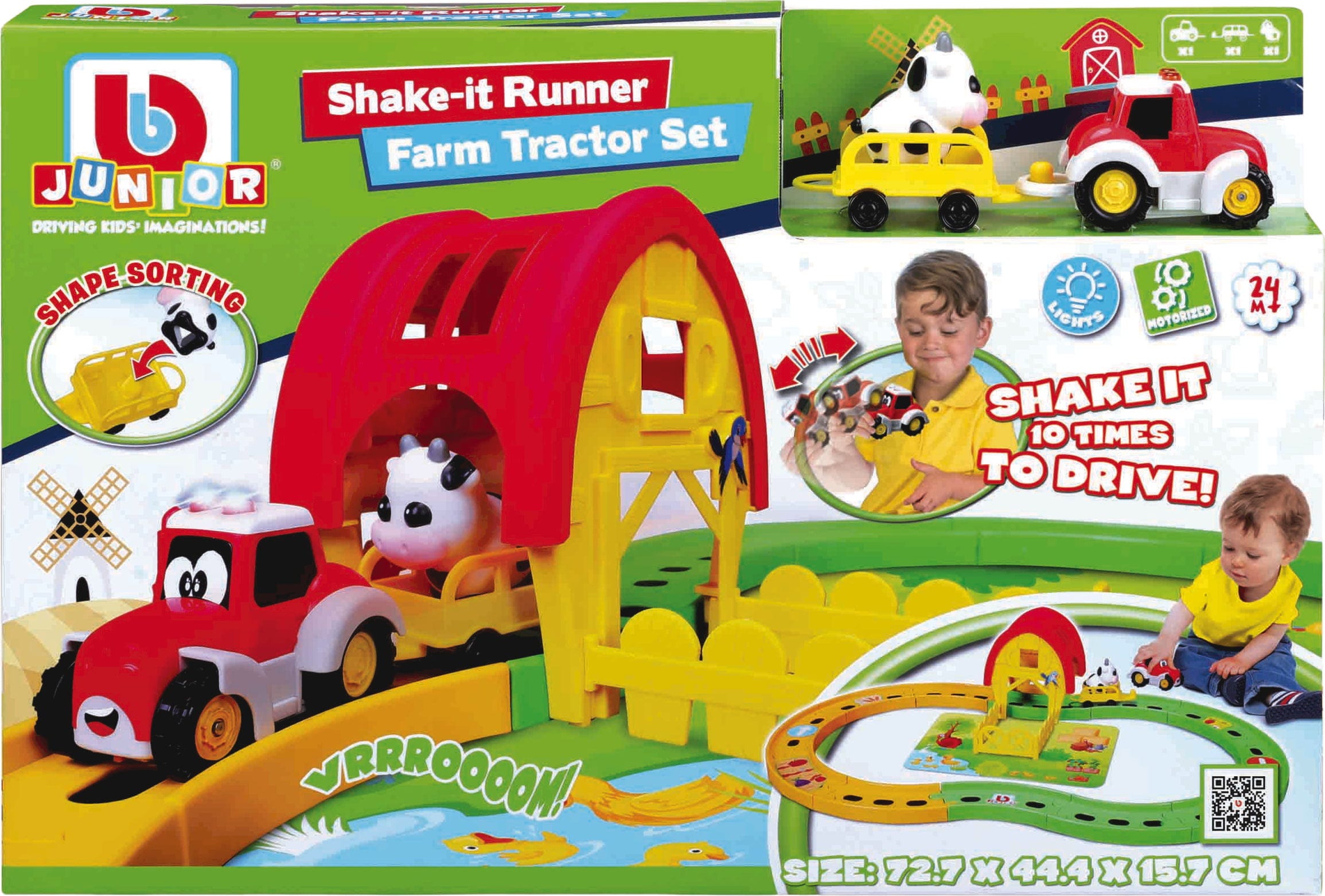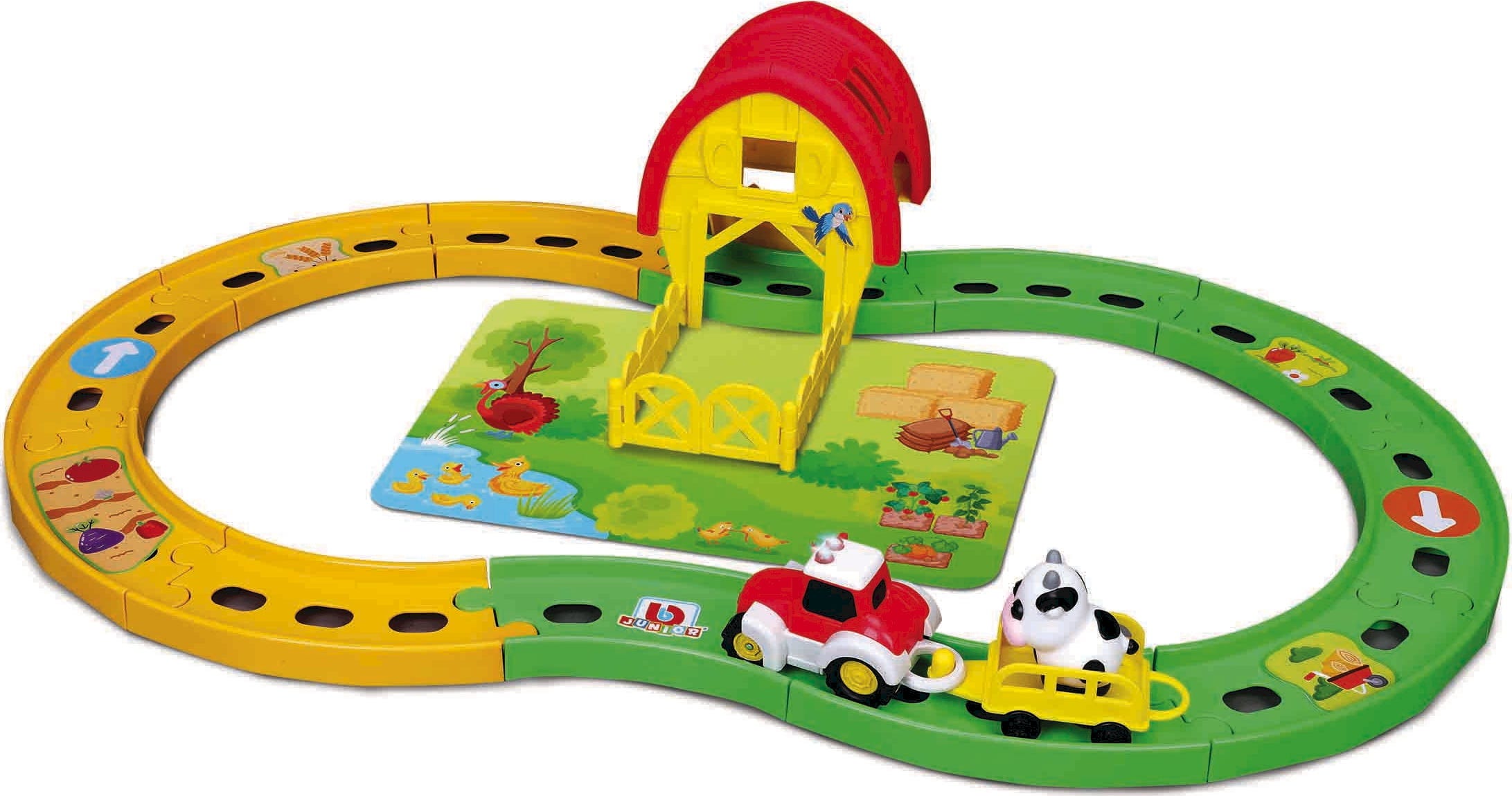 Hol dir das Landleben direkt nach Hause! Mit dem Shake it Runner Farm Tractor Set von BBJunior wirst du zum Profi auf dem Bauernhof. Die große Rennbahn in Form einer liegenden Acht bietet dir jede Menge Platz für spannende Touren mit deinem Traktor, dem Anhänger und deiner neuen Kuh.