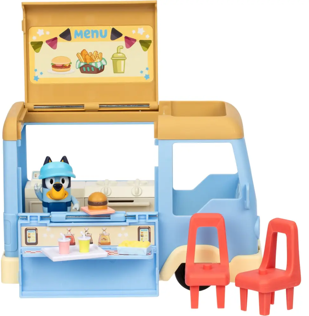Mit dem Bluey Food Truck Spielset eröffnest du deinen eigenen kleinen Imbiss! Fahre mit dem Truck los, parke ihn und klappe ihn zu einem gemütlichen Café mit Sitzplätzen aus. Bluey serviert Burger, Pommes und Getränke – deiner Fantasie sind keine Grenzen gesetzt.