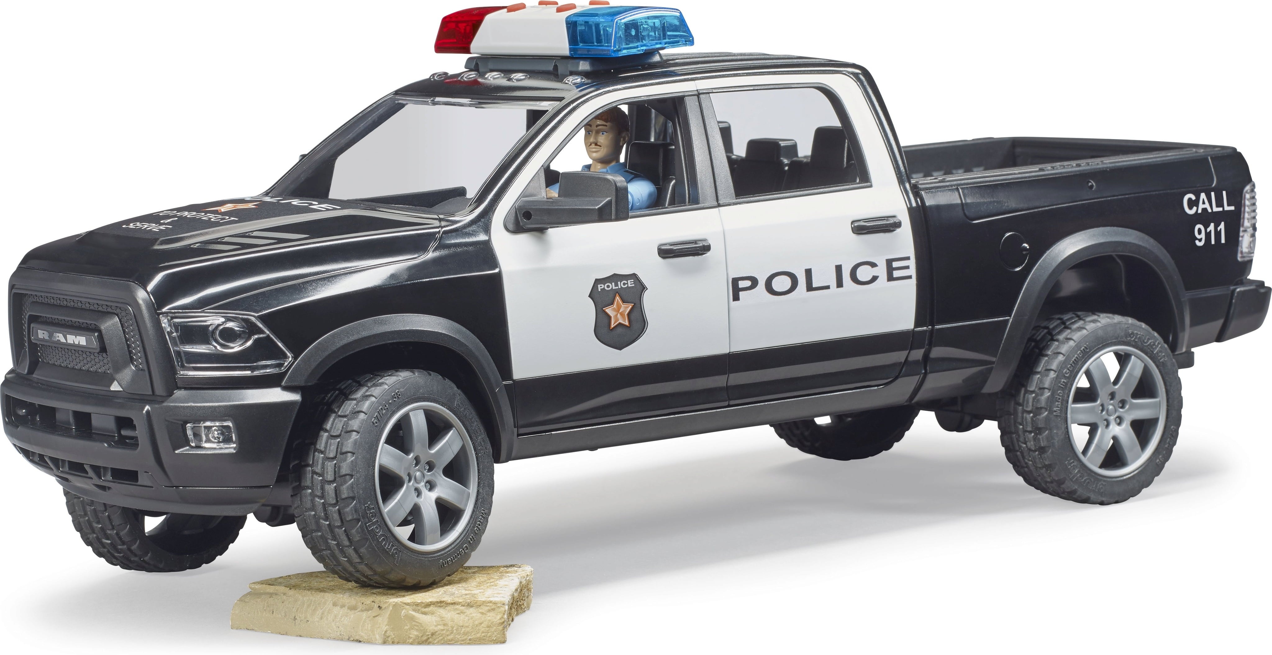 Der RAM 2500 Polizei Pickup verstärkt die BRUDER Einsatzkräfte. Er ist perfekt für Verfolgungsjagden und Einsätze in schwer zugänglichem Gelände geeignet. Mit seinem auffälligen US-Polizei-Design und dem funktionsfähigen Light & Sound Modul lässt er sofort eine spannende Spielatmosphäre entstehen. Die detailreiche Polizistenfigur darf natürlich nicht fehlen.