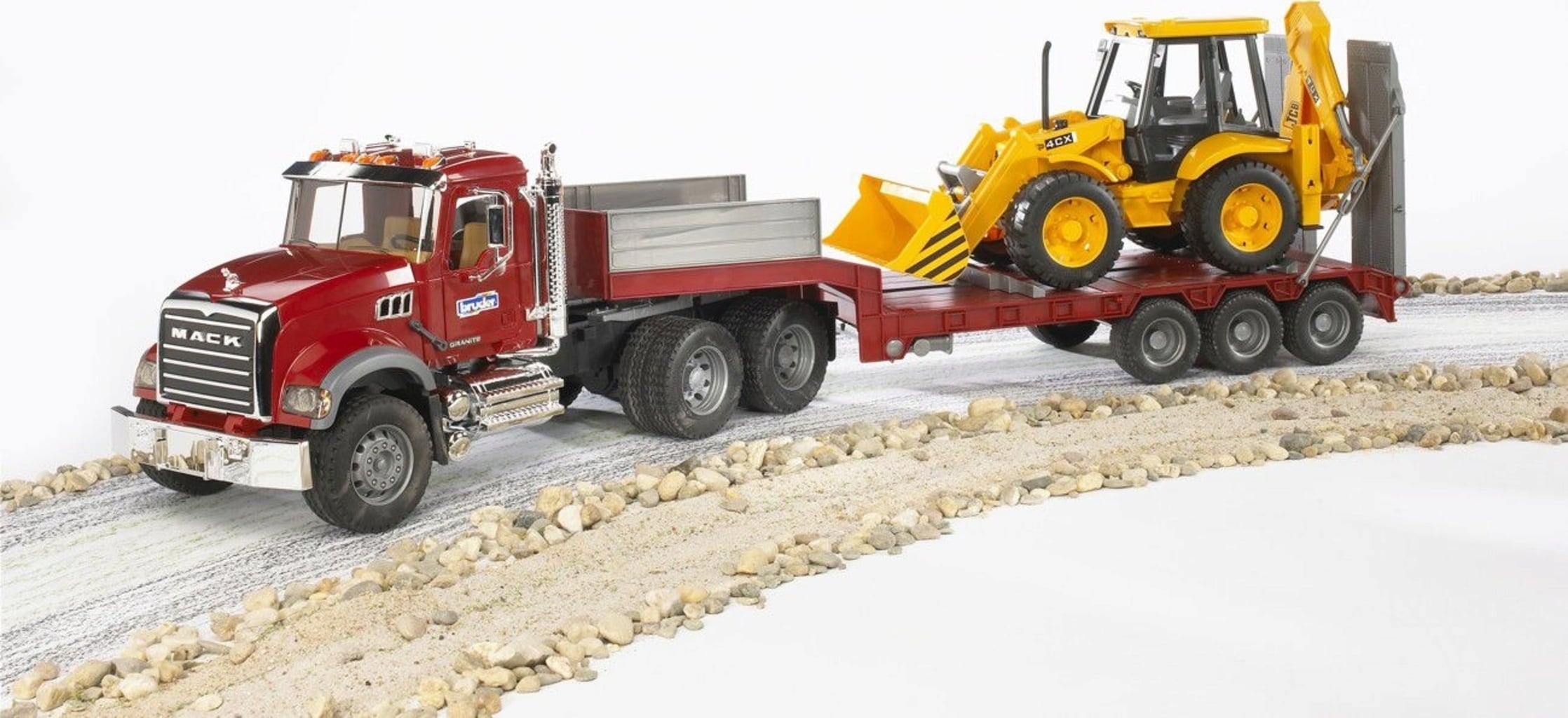 Dieses beeindruckende Set vereint die legendäre amerikanische Power des MACK Granite LKWs mit einem vielseitigen JCB 4CX Baggerlader auf einem Tieflader. Die detailgetreue Gestaltung und viele realistische Funktionen sorgen für ein Spielerlebnis der Extraklasse.