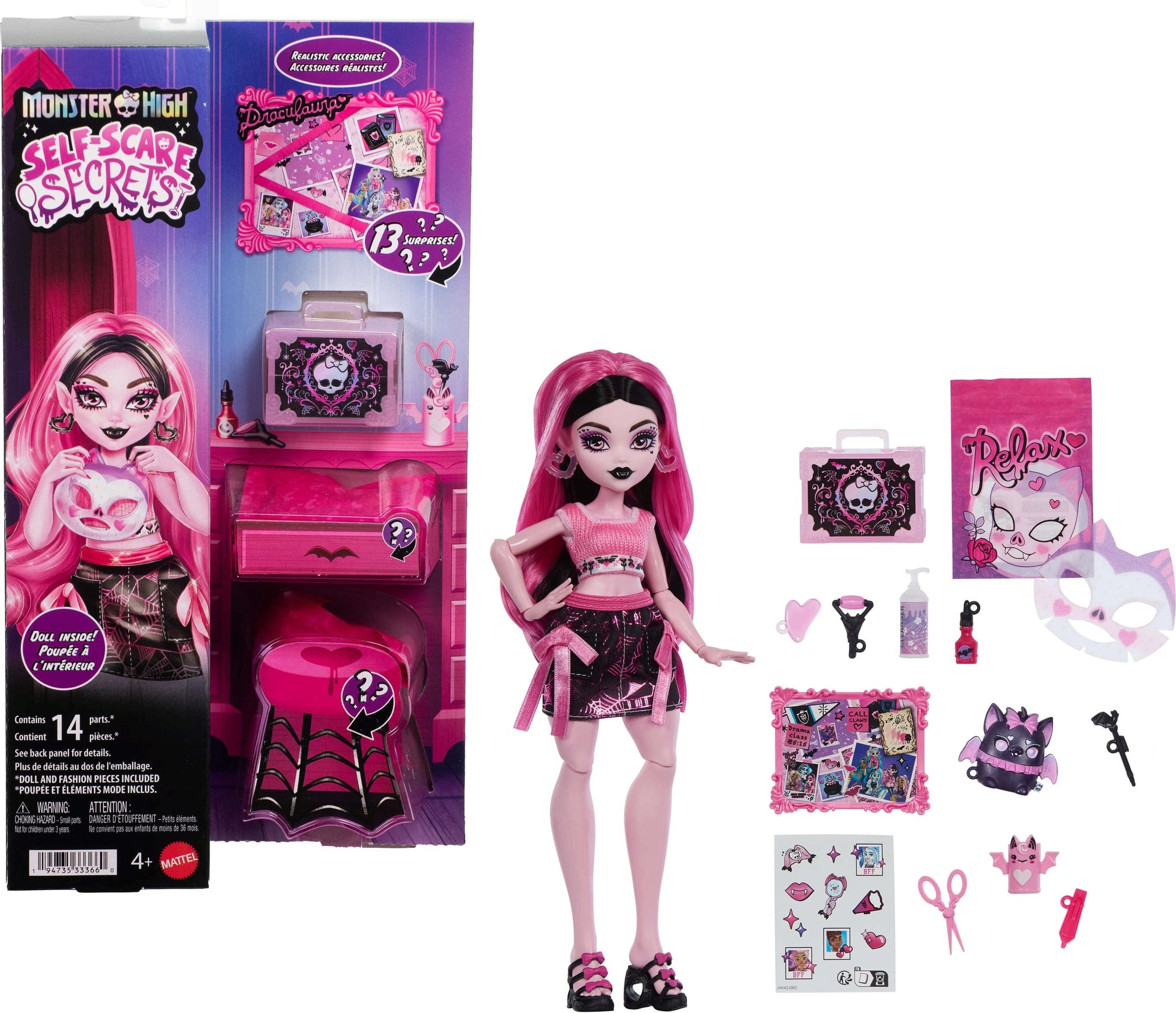 Bereit für eine Auszeit, die unter die Haut geht? Mit der Self-Scare Secrets Reihe entdeckst du, wie die Monster-Clique am liebsten entspannt. Pack die 13 schaurig-schönen Überraschungen aus und begleite Draculaura bei ihrer spuktakulären Beauty-Routine!