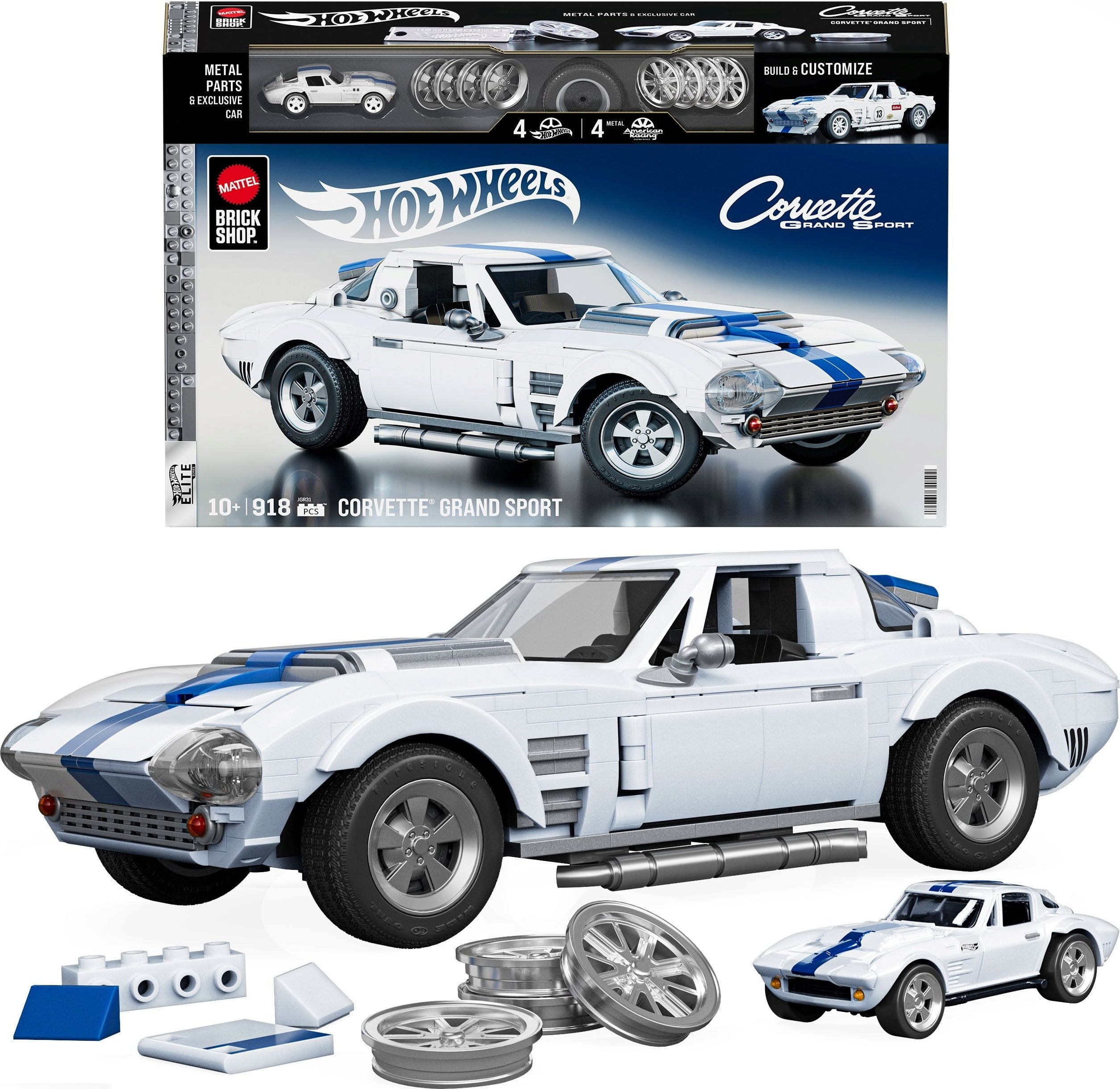 Mit der Corvette Grand Sport aus der Brick Shop Elite Serie wirst du zum Architekten eines echten Straßentitans! Du erschaffst dieses seltene Kraftpaket im Maßstab 1:16 einfach selbst und verpasst ihm mit coolen Metall-Radkappen und individuellen Stickern ein einzigartiges Finish.