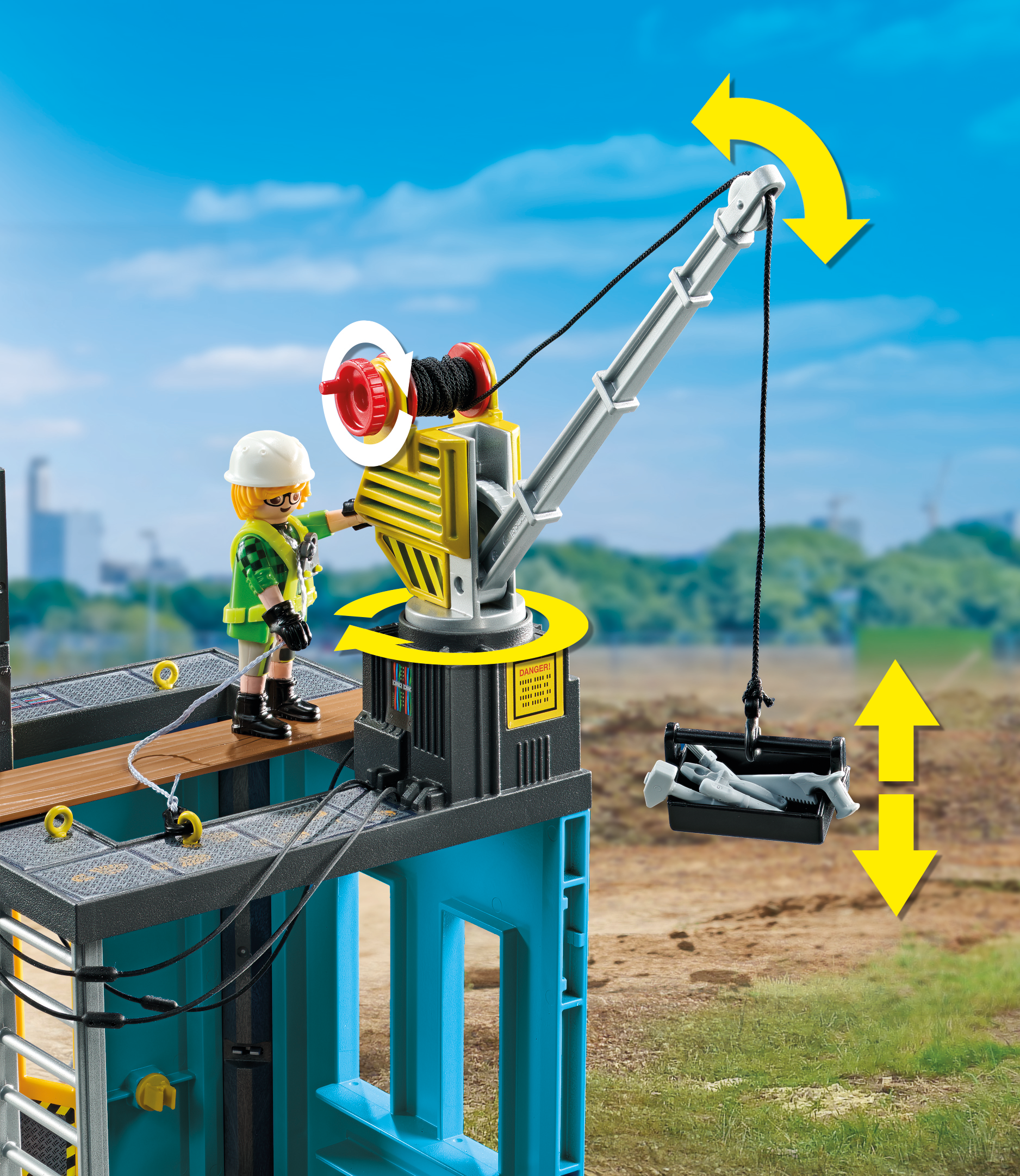- Zubehör: 1 Handschuhaufsatz, 1 Klettergurt, 3 Bauhelme, 1 Armbanduhr, 1 Rüttelplatte, 1 Werkzeugkiste, 1 Baustellentisch, 1 Seilwinde, 3 Silikonkabel
