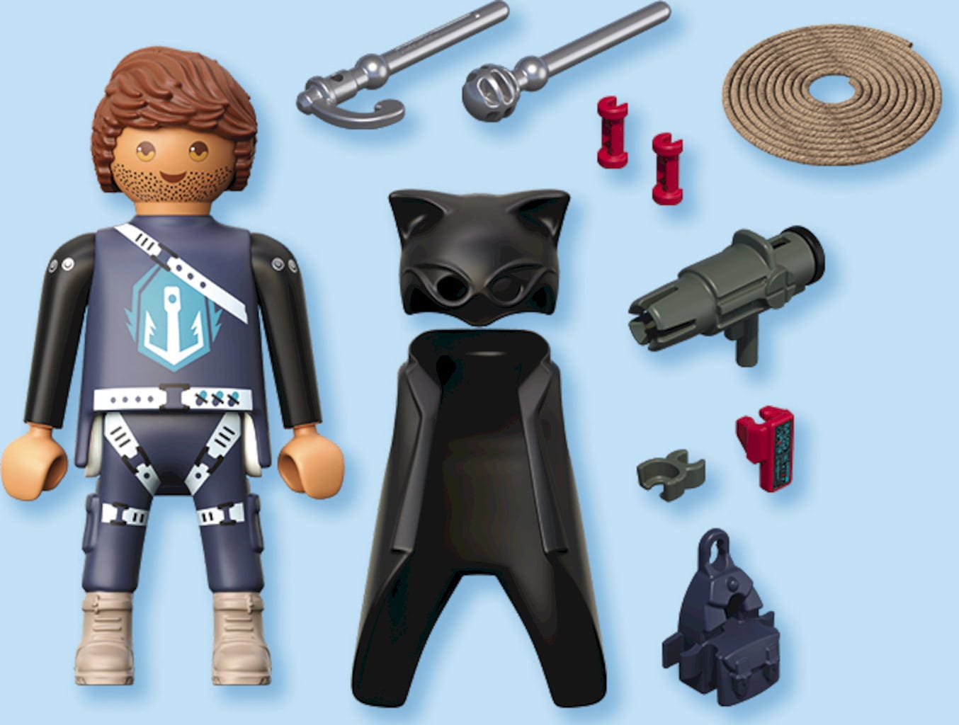 Inhalt: 1 Mann, 1 Mantel-Frack, 1 Rucksack, 1 Armmanschette, 1 Waffe, 1 Enterhaken, 1 Schnur, 1 Kugel-Geschoss, 1 Arm-Computer, 1 Wechselperücke