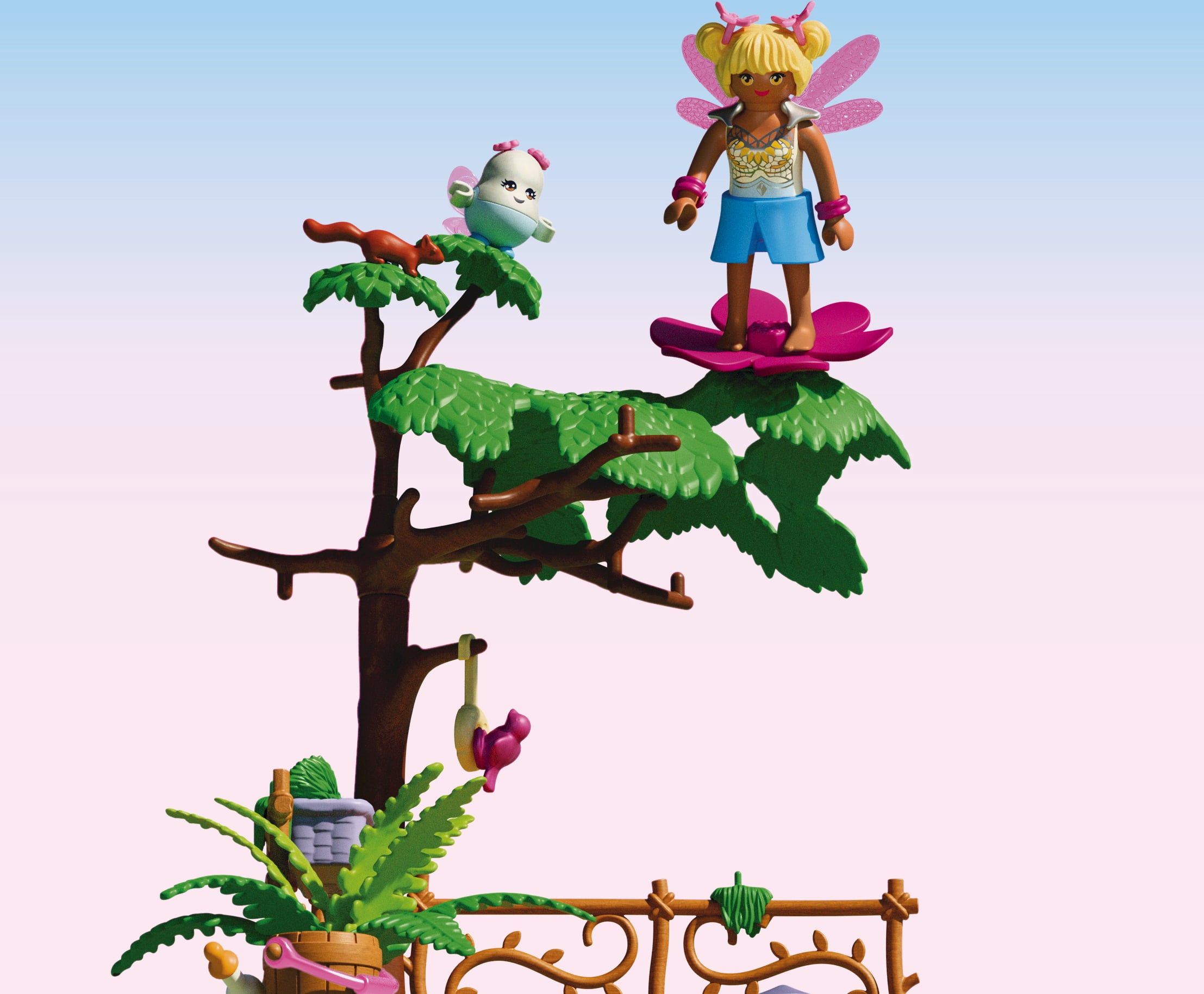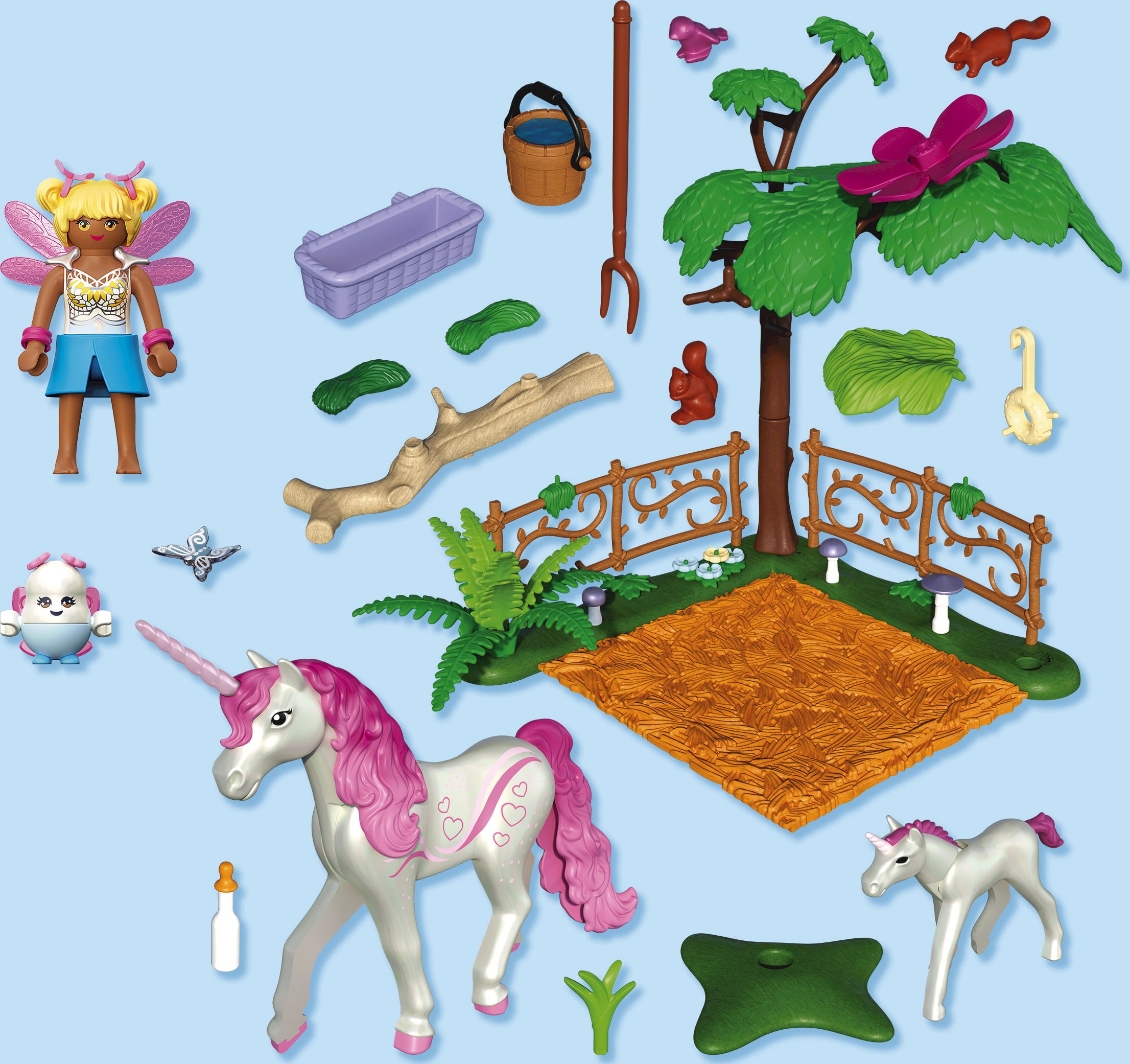 Inhalt: 1 Frau, 1 Joyling, 1 Einhorn, 1 Einhornfohlen, 1 Schmetterling, 1 Vogel, 2 Eichhörnchen; Zubehör: 1 Bodenplatte, 2 Zäune, 1 Baum, 1 Riesenblüte, 1 Pflanze, 1 Blumenkasten, 1 Ast, 1 Spieß, 1 Wassereimer, 1 Milchflasche, 3 Pilze, 2 Haarschleifen, 1 Flügelkragen, 2 Flügel, 2 Armreifen, 1 Ansteckblüte, 1 kleines Flügelpaar