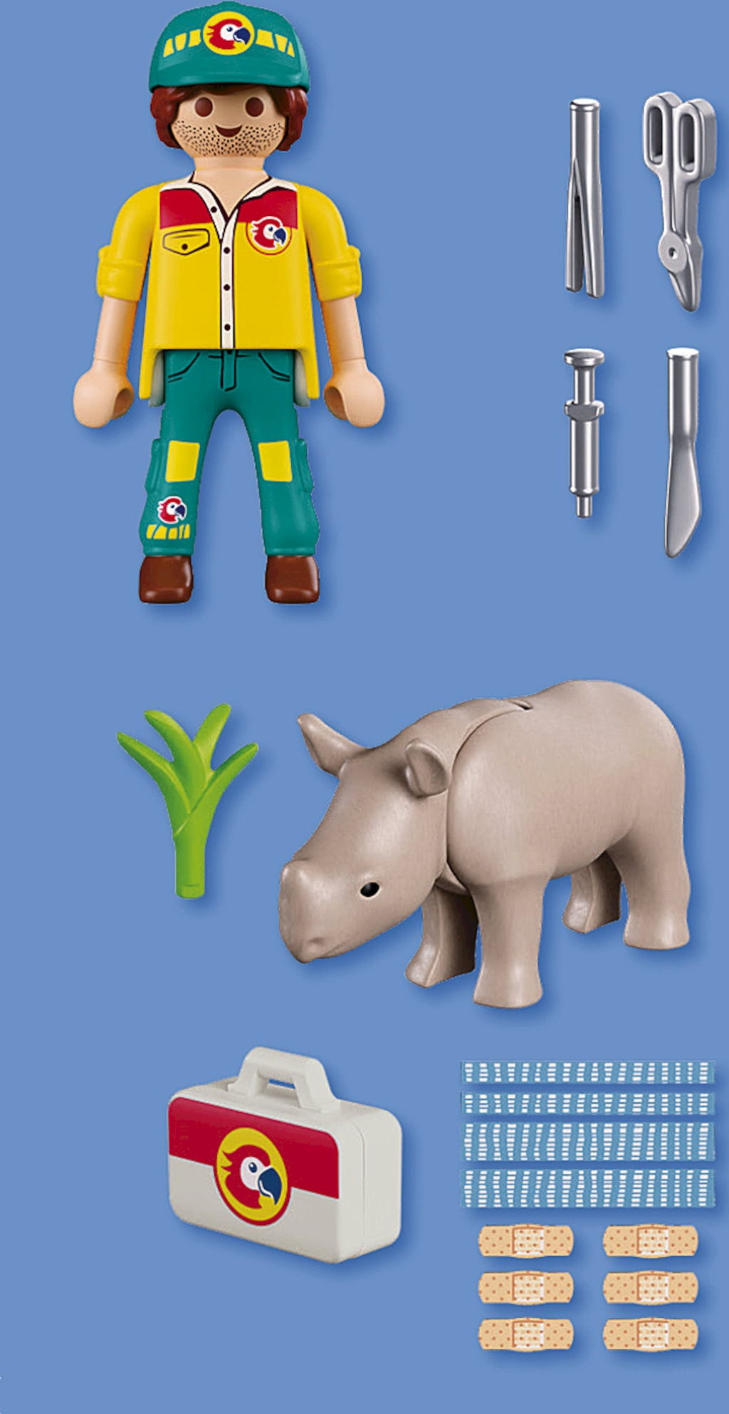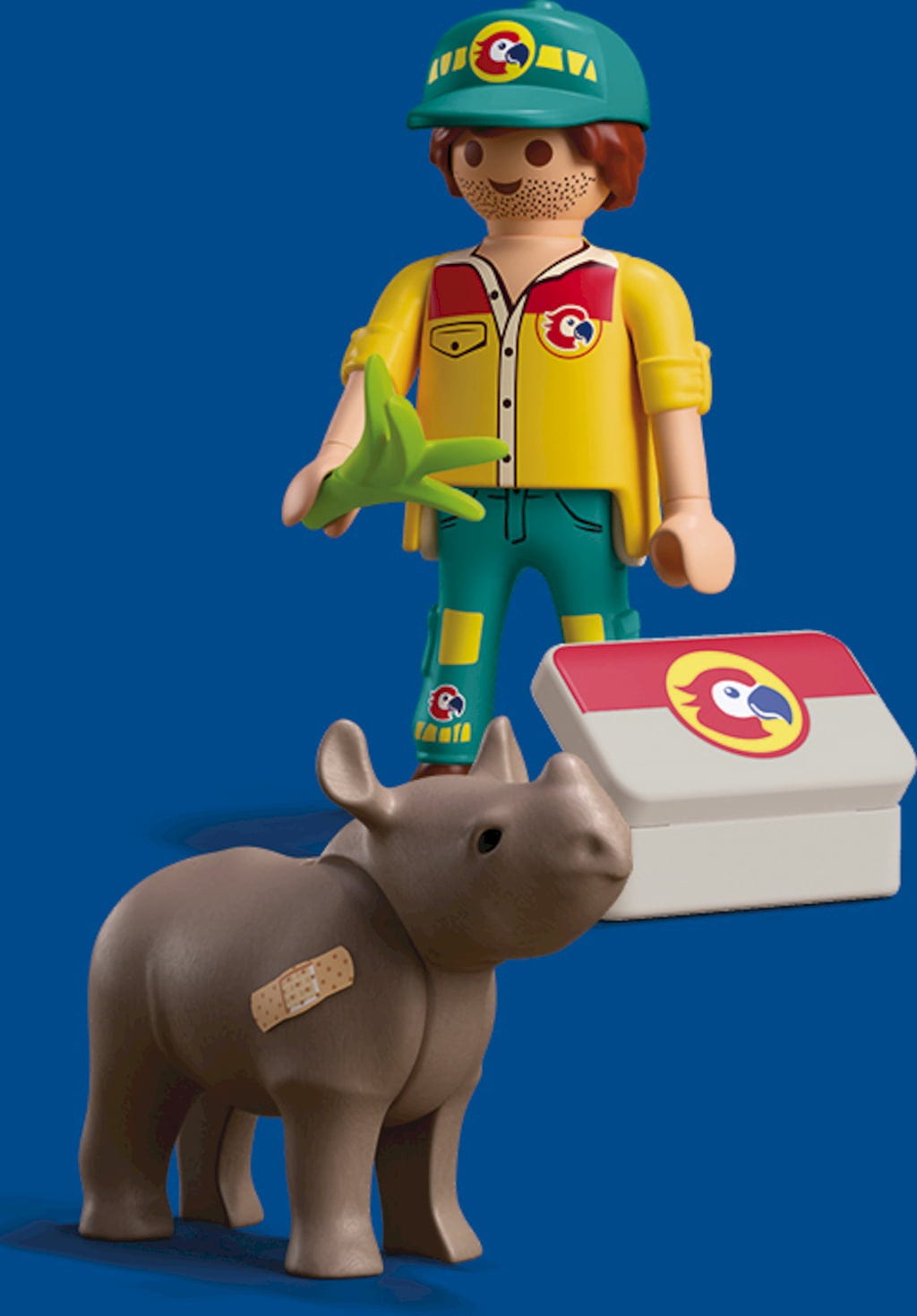 Im modernen Zoo von Playmo-City kümmert sich der Tierpfleger liebevoll um ein krankes Nashorn. Mit speziellem Futter, Verbandszeug und einer Portion Fürsorge wird das Tier bald wieder gesund.